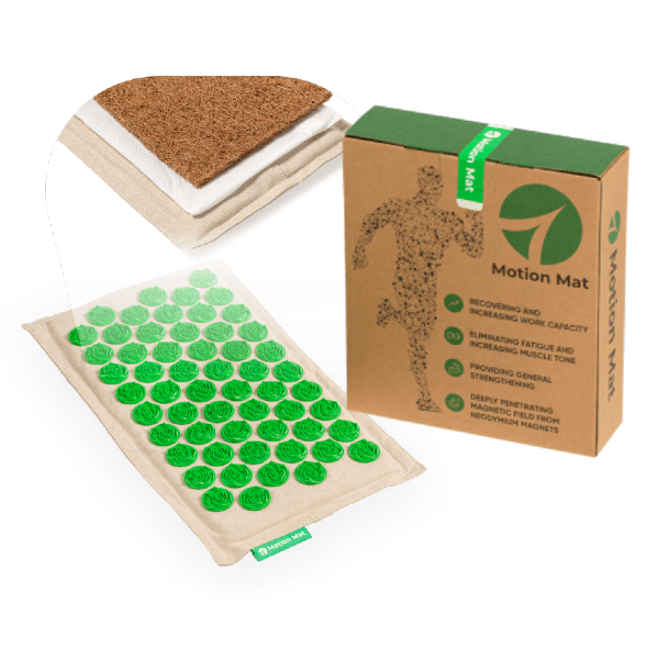 Motion Mat è realizzato con materiali di alta qualità e sostenibili, tra cui lino naturale, fibra di cocco e plastica riciclabile, progettati per garantire durabilità e rispetto ambientale. Alla superficie sono integrati magneti in neodimio, inseriti strategicamente per potenziare l’effetto stimolante sui punti di pressione e migliorare la circolazione sanguigna locale. La composizione si basa sull’utilizzo di materiali naturali e tecnologie innovative, senza componenti farmacologici attivi.