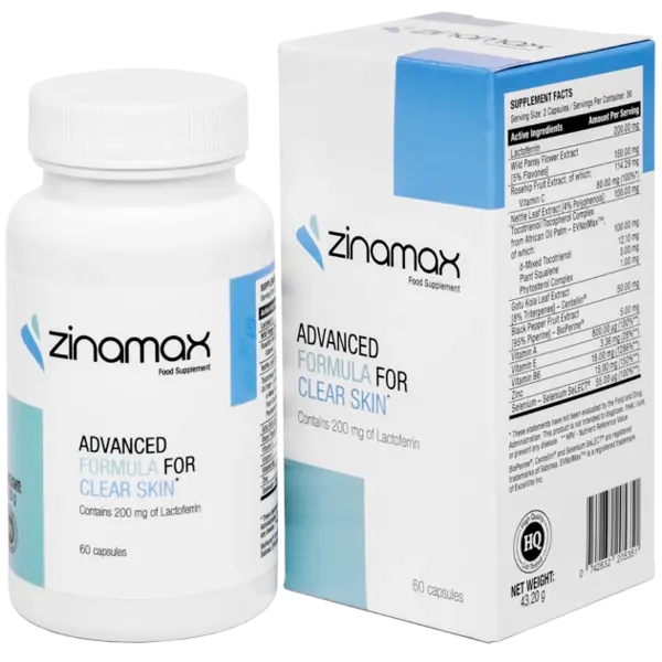 Zinamax è composto da principi attivi e componenti naturali di elevata qualitĂ , tra cui Lactoferrin, estratto di Viola tricolor [con contenuto di flavoni], estratto di rosa canina ricco di vitamina C, estratto di ortica [con elevato contenuto di polifenoli], complesso di Tocotrienoli e Tocopheroli derivati dallâolio di palma africano EVNolMaxâ˘, estratto di Centella asiatica [ricco di triterpeni], estratto di pepe nero [contenuto di piperina], insieme a vitamine A, E, B6, zinco e selenio in forma altamente biodisponibile. La formulazione si distingue per lâintegrazione di antiossidanti naturali e nutrienti essenziali per la fisiologica funzione della pelle.